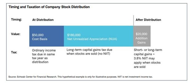 Also, this strategy can help to lower your future Required Minimum Distribution (RMD) amount, which is an amount that you have to distribute annually from your retirement account(s), per the IRS guidelines. The NUA transaction allows you to shift assets to a non-retirement account that does not have a required annual distribution, so the assets can grow as long as you would like them to.